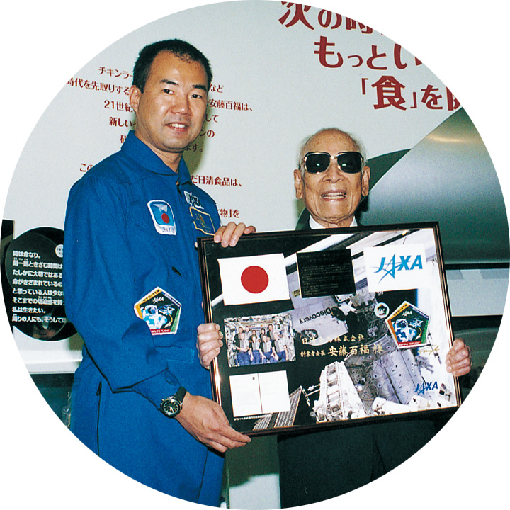 野口宇宙飛行士は大きく手を振りながら記念館に向かい、正面玄関前で待っていた安藤百福と固く握手、開ロー番、「おいしいラーメンを作っていただきありがとうございました」とお礼の言葉を述べられた。これに応えて安藤百福も野口宇宙飛行士の労をねぎらった。
