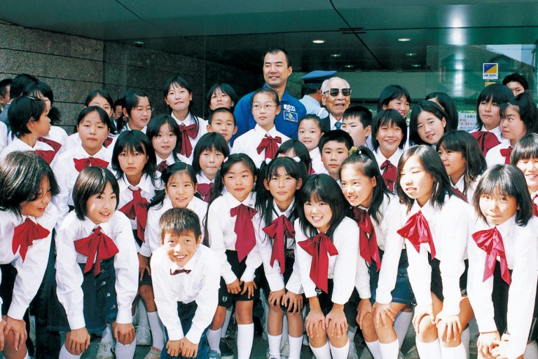 地元小学生や池田市民に迎えられて、野口宇宙飛行士が「インスタントラーメン発明記念館」へ。