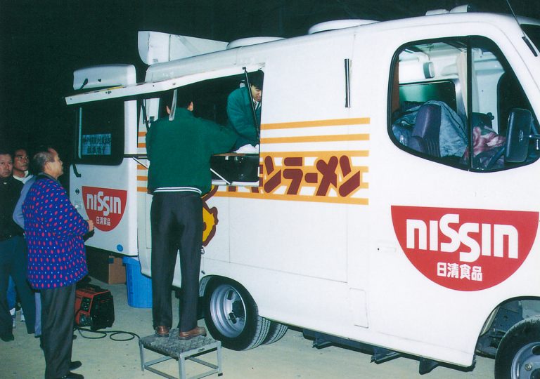 1995.1 被災地に出動する「チキンラーメン号」 阪神・淡路大震災では、給湯機能付きキッチンカー「チキンラーメン号」が活躍した。震災翌日の1月18日、安藤百福指揮のもと、最も被害の大きかった東灘区に同号を派遣。約1,500人の被災者にお湯を入れた温かい「チキンラーメン」を配った。こうした救援活動は延べ9回行われ、救援物資を含めて100万食を提供した。