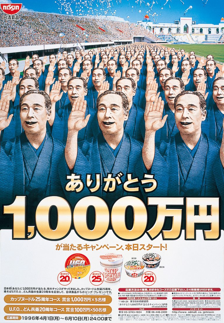 1996.4 「カップヌードル」発売25周年、「日清のどん兵衛」「日清焼そばU.F.O.」発売20周年記念キャンペーン 1996年、3種のカップめんが、それぞれ発売25周年・20周年を迎えたのを記念して、同年4月1日から6月10日まで「ありがとう1,000万円が当たるキャンペーン」を実施した。4月1日、公正取引委員会がオープン懸賞の賞金規制を上限100万円から1,000万円にまで緩和したのにいち早く対応して、国内初のビッグプレゼントを企画。応募総数は1,378万3,842通で、この種のキャンペーンとしては「歴史的な数字」となった。