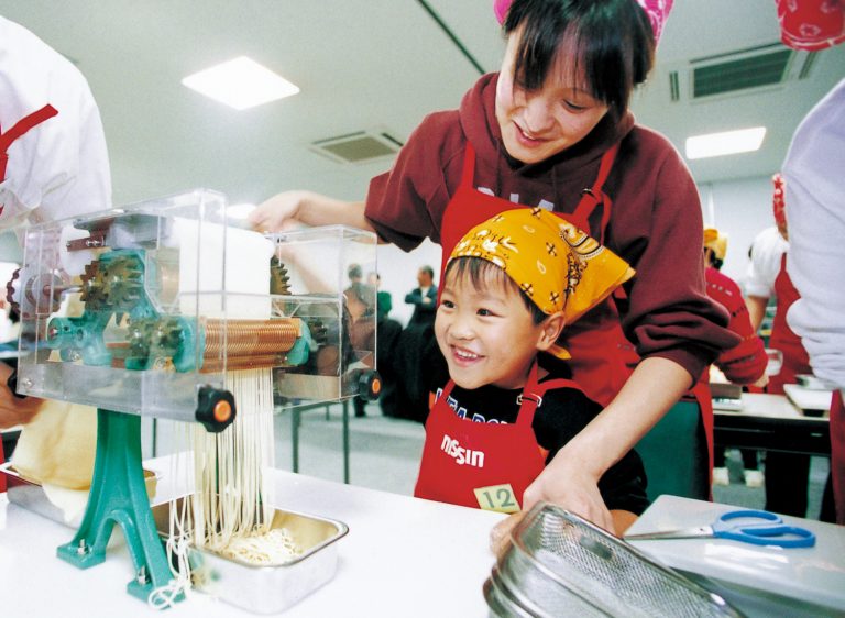 2階のイベントホールには、チキンラーメンを手作りできるコーナーが設けられた。小麦粉をこね、のばし、蒸したあとに味付けをし、「瞬間油熱乾燥法」で乾燥させ、袋詰めするまでの工程が楽しめる。