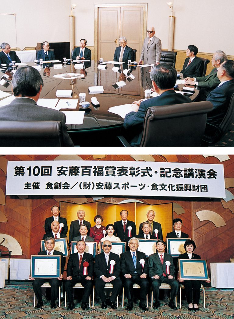 1999.6 「食創会 安藤百福記念賞表彰式」で初の大賞 食創会は、新しい食品や技術を創造した人・企業を表彰する事業を最大の柱として1996年6月13日に創設。毎年、安藤百福記念賞が贈られているが、1998年度「食創会 安藤百福記念賞表彰式」では、「機能性食品科学の創成」に寄与した藤巻正生氏ら3名の研究者に初の大賞が贈られた。2002年度から大賞の副賞が1,000万円に増額された。(写真下は2006年2月27日の第10回記念大会)