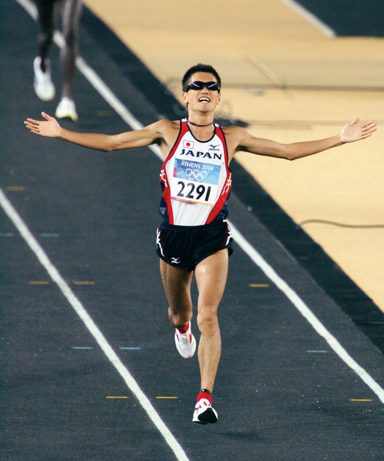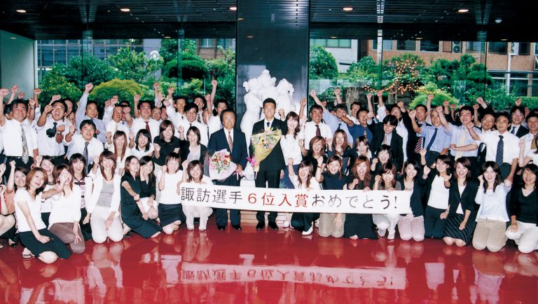 2004.8 「アテネオリンピック」で諏訪選手が6位入賞 8月29日午後6時 (日本時間30日午前0時)、各国を代表する102名の選手が一斉にスタート。諏訪利成選手は徐々に順位を上げ競技場内で一人を抜いて、見事6位でゴールした。帰国後、諏訪選手と白水昭興監督は大阪本社を訪問。ロビーに集まった100名近い社員が拍手で出迎え、2人を中心に記念撮影を行った。