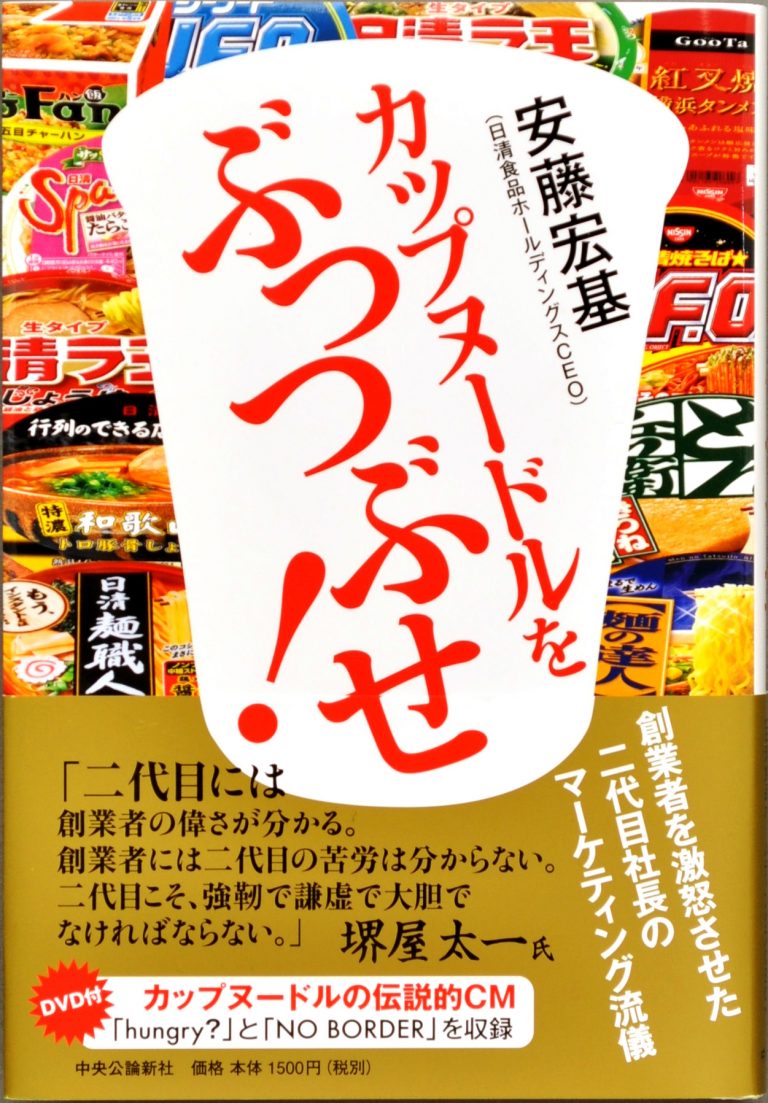 2009.7 安藤CEOの初著作『カップヌードルをぶっつぶせ!』を出版 安藤宏基CEOが、創業者であり父でもある安藤百福の類まれなマーケティング力を綴った初の著作『カップヌードルをぶっつぶせ!』が10月7日に刊行。タイトルは、安藤CEOが社長に就任した際、社内を活性化するために提唱したスローガン「打倒!カップヌードル」からイメージして付けられた。
