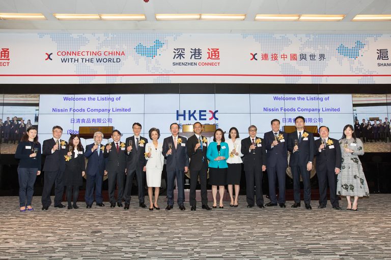 2017.12 香港日清が香港証券取引所メインボードに上場 12月11日、日清食品ホールディングスの中国子会社・日清食品有限公司 (香港日清) が香港証券取引所のメインボードに上場。9時30分、香港市場午前の取引が開始されると、香港日清の株価も大型スクリーンに映し出され、秒刻みで価格が変動した。安藤宏基CEOと安藤清隆総代表は多くのメディアからの取材を受け、夜は「Kowloon Shangrila」ホテルにて華やかな宴が催された。