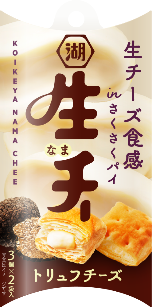 「生・チー トリュフチーズ」は、カマンベールチーズを使用した、なめらかチーズフィリングに芳醇なトリュフを合わせ、オーブンで香ばしく焼き上げた多層のさくさくパイで包み込んだ一口サイズの "ご褒美パイ" です。口いっぱいに広がる芳醇なトリュフとカマンベールチーズが織りなす、絶妙なハーモニーをお楽しみいただけます。