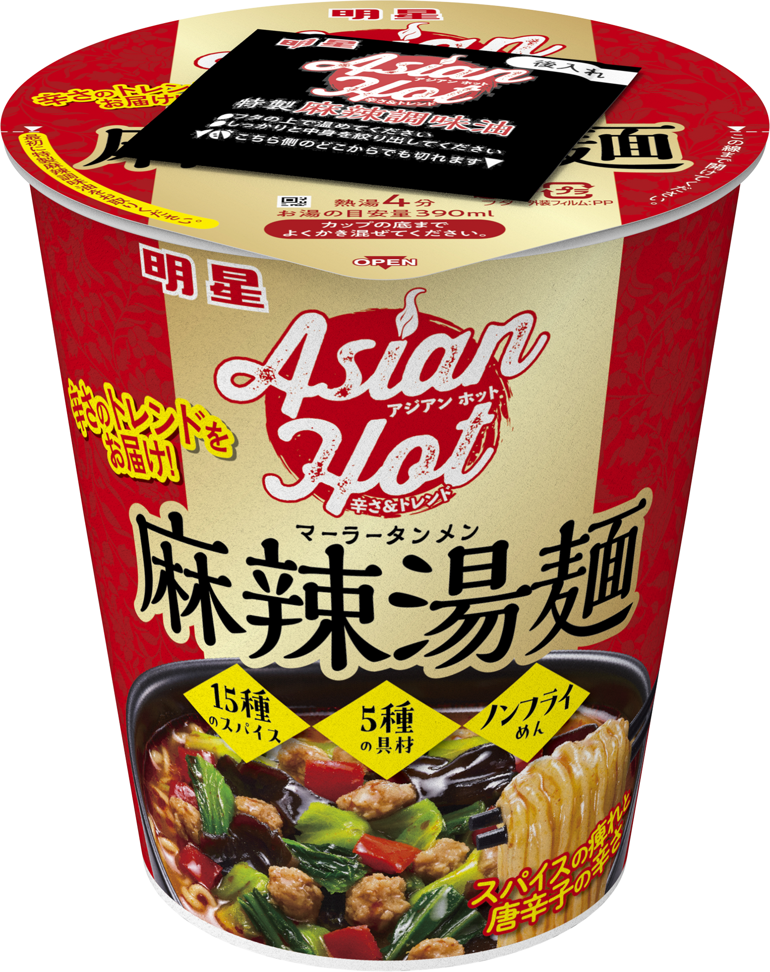 シリーズ第1弾は、「明星 Asian Hot 麻辣湯麺」。麻辣湯麺は日本でも専門店が続々出店し連日行列ができるほどの人気で、20~30代からも絶大な支持を集めています。このトレンドの味である「明星 Asian Hot 麻辣湯麺」は、牛と豚をベースに豆板醤等で味を調え、ジンジャー・ガーリック・コリアンダー等の15種のスパイスを使用し、さらに花椒 (ホワジャオ) の香りが広がる特製麻辣調味油で仕上げる麻辣湯スープに、豚肉ダイス・チンゲン菜・キャベツ・きくらげ・赤ピーマンという彩りのよい5種の具材を使用しています。麺はスープによく合う明星独自のノンフライめんです。