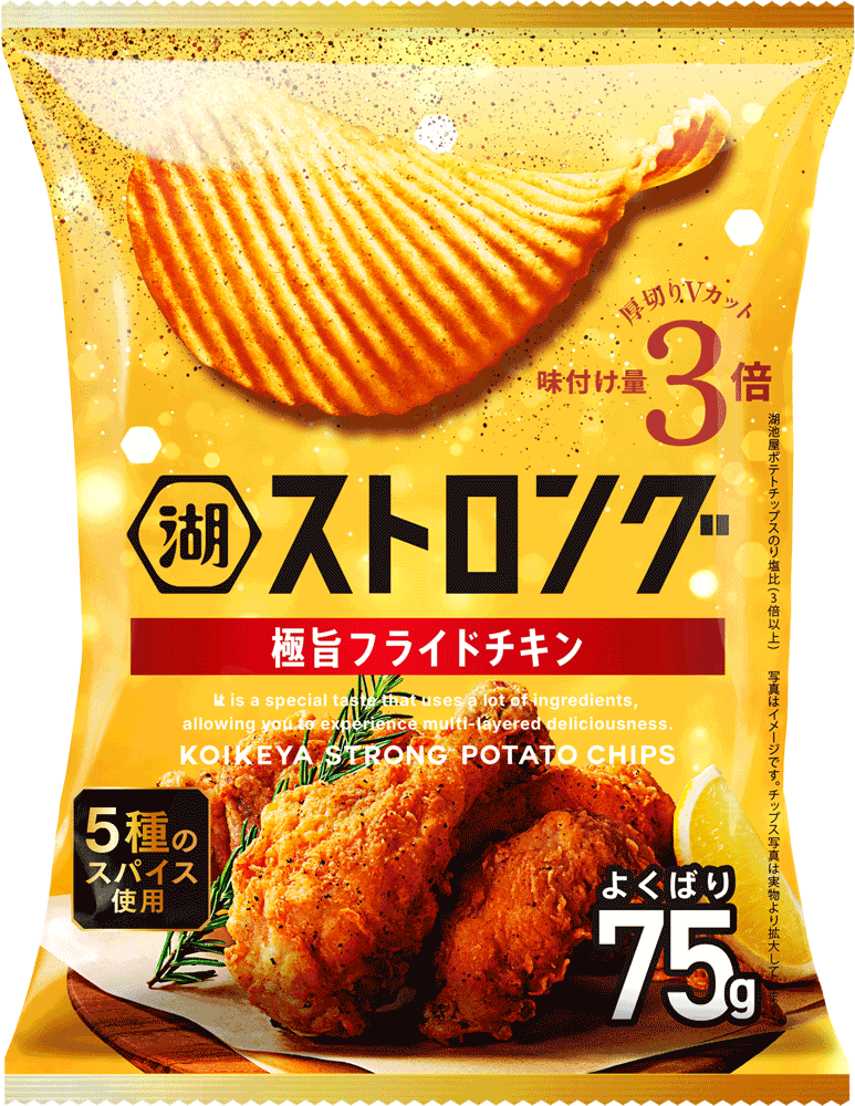 | 商品名 / 内容量 | 「湖池屋ストロング 極旨フライドチキン」/ 75g 「湖池屋ストロング 辛旨 海老チゲ」/ 75g |