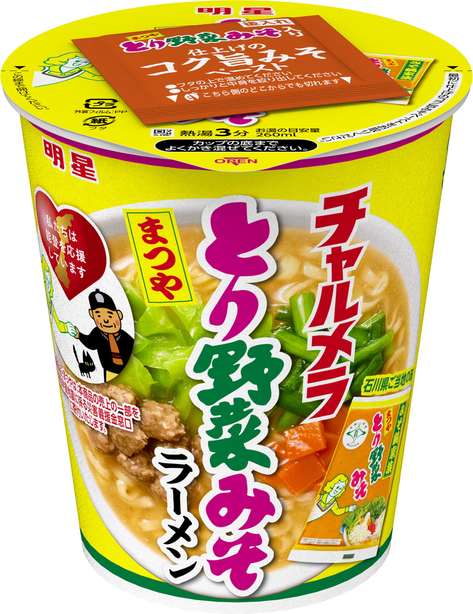 本商品の売り上げの一部を令和6年能登半島地震に係る災害義援金窓口に寄付させていただくにあたり、とり野菜みその公式キャラクター「とりさん」とチャルメラおじさんがアイコンとして登場します。石川県が公開した応援消費プロジェクトのロゴを併せて用いることで、まつやと明星食品が共同で能登を応援していることを表すパッケージとなっています。