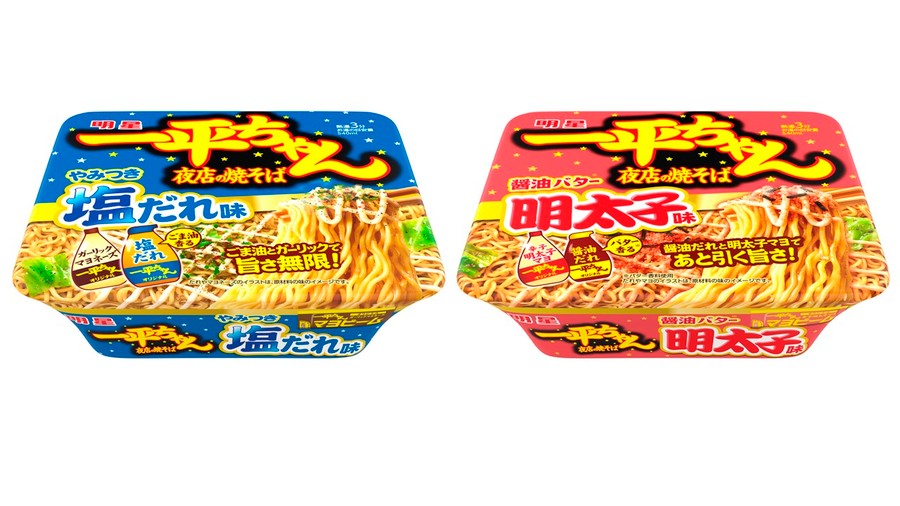 「明星 一平ちゃん夜店の焼そば 関西風お好み焼ソース味」「(同) やみつき塩だれ味」「(同) 醤油バター明太子味」(1月上旬より順次リニューアル発売)