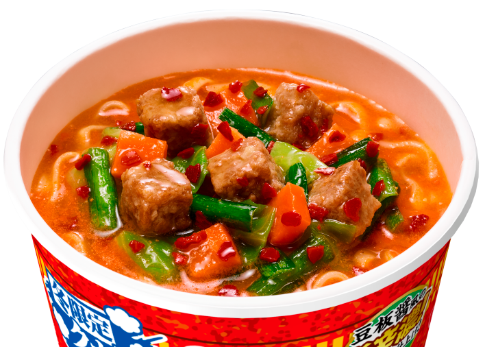 「カップヌードル 辛味噌」は、コクのある3種の味噌をベースに、肉と野菜の旨みを加え、豆板醤 (トウバンジャン) の風味と唐辛子の辛みをきかせた、"旨辛" で濃厚なスープが特長です。後引く辛さがクセになる一杯に仕上げました。