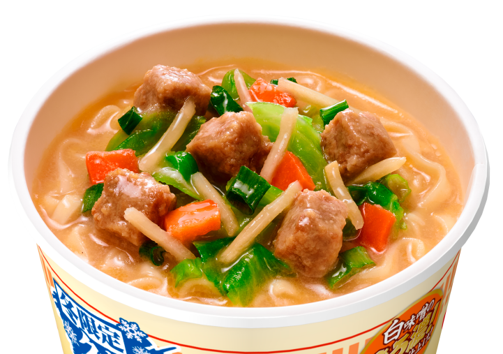 「カップヌードル 白味噌」は、甘みのある3種の白味噌をベースに、肉味噌の風味を加えた、まろやかで濃厚なスープが特長です。アクセントとして、生姜の香りをきかせました。