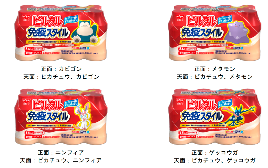 今回、酢酸菌GK-1による「健康な人の免疫機能の維持に役立つ」機能を持つ「ピルクル 免疫スタイル」(機能性表示食品) を初めて "ポケモンパッケージ" で発売します。また、「ピルクル400」(特定保健用食品)、「ピルクル ミラクルケア」(機能性表示食品) も限定パッケージで展開します。おなじみのピカチュウ、メタモン、カビゴンのほか、『ポケットモンスター』シリーズの最新作「Pokémon LEGENDS Z-A」でも活躍するチコリータ、ポカブ、ワニノコなど、全12匹のポケモンをデザインしています。