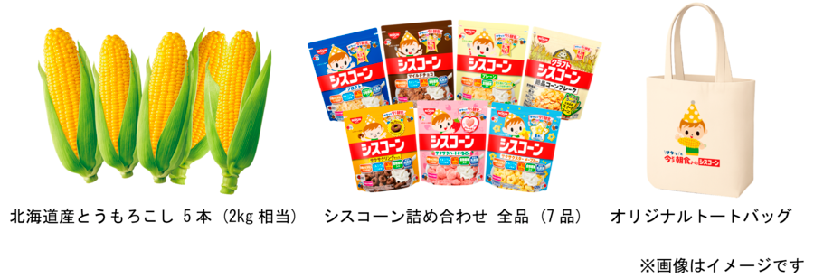 対象商品をお買い上げいただいた方の中から抽選で、A賞として「北海道産とうもろこし 5本 (2kg相当)」と「オリジナルトートバッグ」を100名に、B賞として「シスコーン詰め合わせ 全品 (7品)」と「オリジナルトートバッグ」を1,000名に、それぞれセットでプレゼントします。なお、「オリジナルトートバッグ」は素材の一部に "とうもろこし" を使用しています。