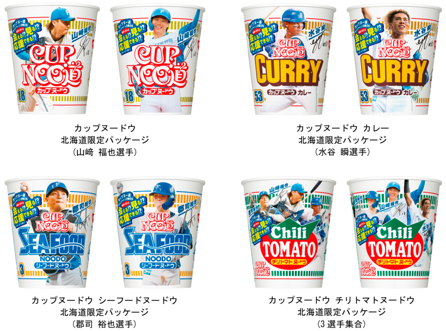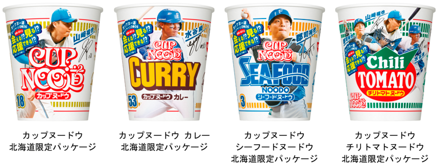 - 北海道にちなみ、ブランドロゴ「CUP NOODLE」の "DLE" を "道" に置き換え、北海道日本ハムファイターズの山﨑 福也選手、水谷 瞬選手、郡司 裕也選手をデザインしました。「レギュラー」「カレー」「シーフード」には各選手のプレーシーンや喜ぶ姿を、「チリトマト」には3選手の集合写真を使用したデザインをそれぞれ2種類、計8種類で展開します。