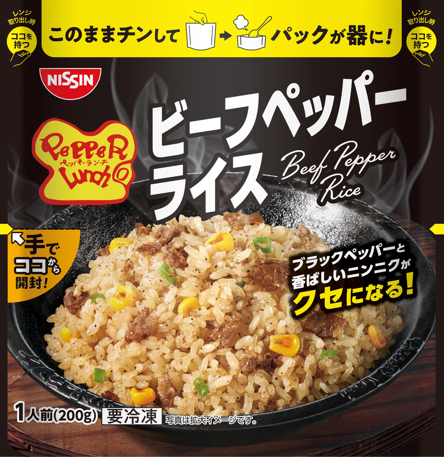今回発売する「冷凍 日清 ペッパーランチ監修 ビーフペッパーライス」は、ブラックペッパーのキレとニンニクの香ばしさがクセになる一品です。実際に炒めることで風味豊かに仕上げたごはんと具材に、しょうゆとマーガリンでコクを加えました。具材には、「ビーフペッパーライス」でおなじみの牛肉、コーン、ネギを入れました。