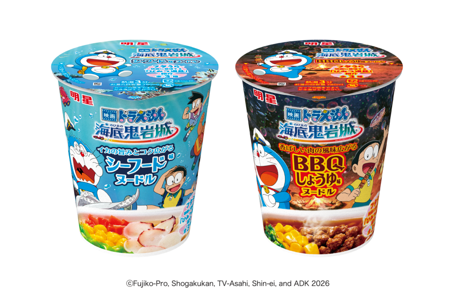(右)「明星 映画ドラえもん 新・のび太の海底鬼岩城 BBQしょうゆ味ヌードル」のオリジナルイラスト