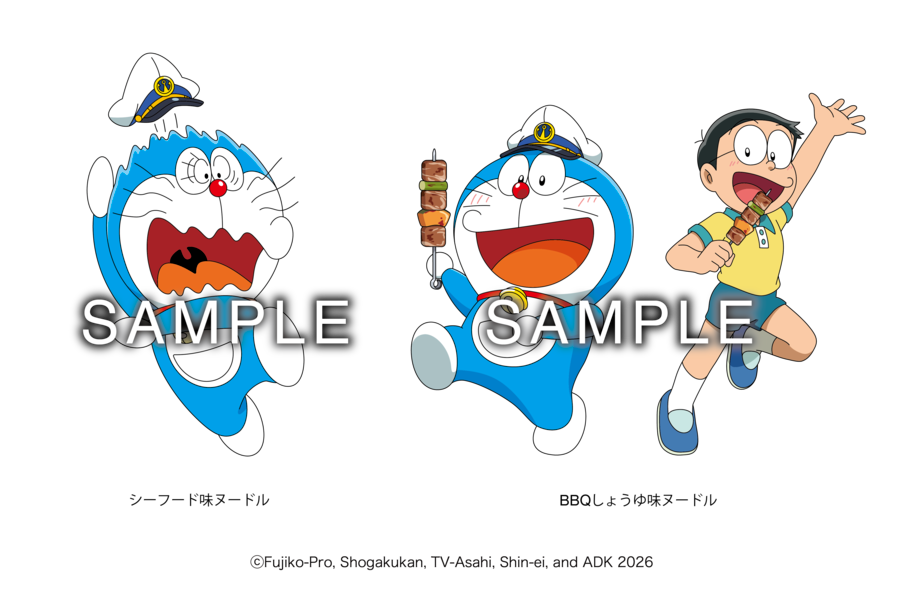 パッケージデザインには、ドラえもんやのび太くんなどが登場。それぞれのフレーバーに合わせて、「シーフード味ヌードル」では海中を、「BBQしょうゆ味ヌードル」では海底でバーベキューを楽しむドラえもんたちの様子が描かれています。中でも、驚いた表情のドラえもん (シーフード味ヌードル) と、仲良くバーベキューの串を持つドラえもんとのび太くん (BBQしょうゆ味ヌードル) は、この商品のために描かれたオリジナルイラストです。
