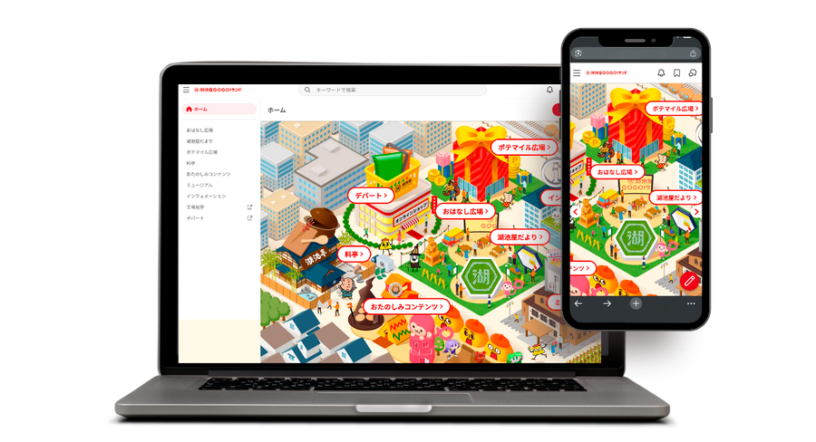 「湖池屋GOGO! ランド」は「街」をテーマとした世界観で構成されています。会員登録 (無料) をされたお客様は、この街の「住人」として集い、街の仲間との交流や、コンテンツに参加して楽しむことができます。商品やブランドの魅力を体験いただき、湖池屋のものづくりや想いをより身近に感じていただける場を目指しています。