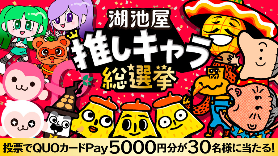 当サイトの開設を記念し、ファンサイト内にて「湖池屋推しキャラ総選挙」を実施します。本企画では、湖池屋を代表する9キャラクターの中から、ファンの皆さまの投票によって1位を決定します。投票にご参加いただいた方全員に、サイト内で使用できる「100ポテマイル」をプレゼント。さらに、抽選で30名様には「QUOカードPay 5,000円分」が当たります。