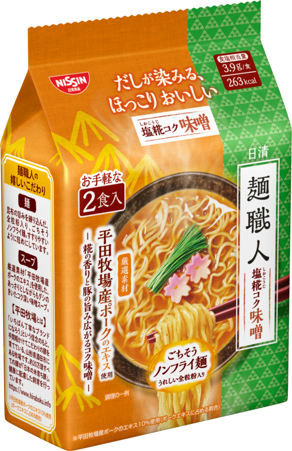 今回発売する「日清麺職人 塩糀コク味噌」は、塩糀の香りが広がるやさしい口当たりの味噌スープに、厳選素材として "平田牧場産ポーク" のエキスを使用*し、豚だしの旨みが際立つコク深い一杯に仕上げました。全粒粉入りのしなやかな中太ウェーブ麺は、昆布の旨みを練り込むとともに、すすりやすいように短くしています。