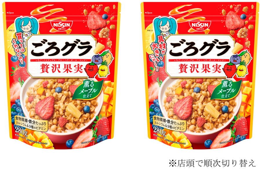 また、テレビCMの放映にあわせ、「ごろグラ 贅沢果実」のパッケージに初音ミクと「具材キャラクター」が期間限定で登場します。