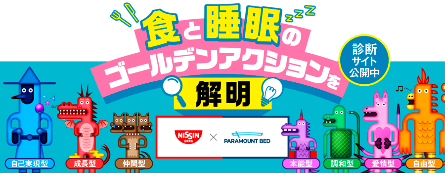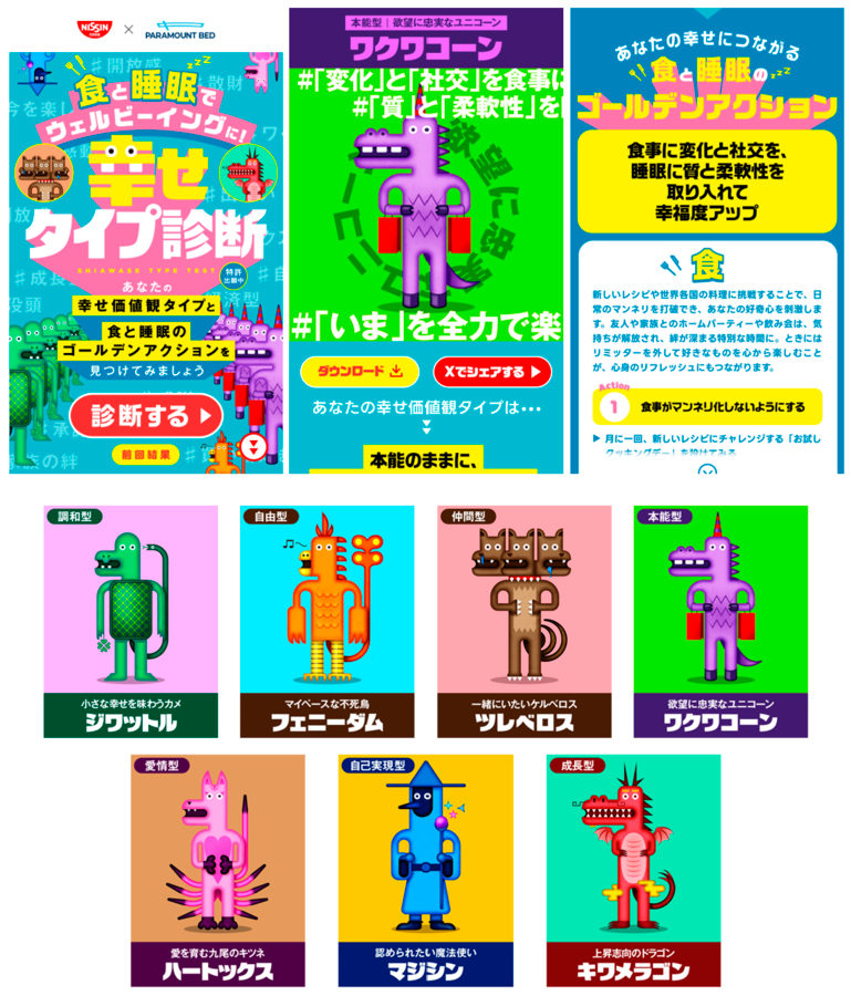このサイトでは、「幸福の価値観」の7つのタイプをキャラクターで表現しています。幸せや心の充足を感じる瞬間に関する設問に回答することで、自分の価値観に合ったタイプを判定し、「食」と「睡眠」のゴールデンアクションを確認することができます。