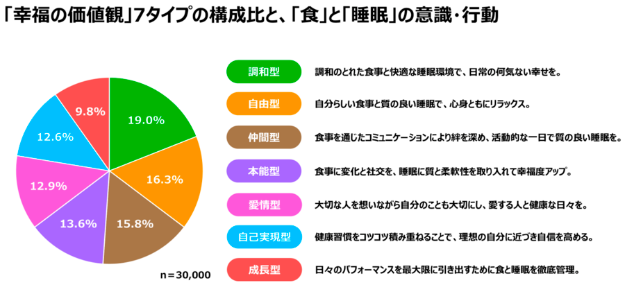 日清食品株式会社 (代表取締役社長:安藤 徳隆) とパラマウントベッド株式会社 (代表取締役 社長執行役員:木村 友彦) は、両社で進める『「食」と「睡眠」によるウェルビーイング向上プロジェクト』の一環として、3万人の一般生活者を対象とした調査を実施し、「幸福の価値観」を7つのタイプに分類しました。さらに、ウェルビーイング向上につながる「食」と「睡眠」のゴールデンアクション (推奨行動) をタイプ別に定義しました。