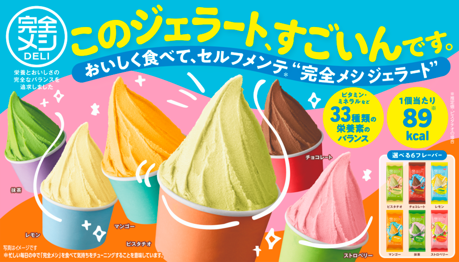 今回、「完全メシ」ブランド初のデザートメニューとなる「冷凍 完全メシ DELI ジェラート」を新発売します。ピスタチオ、マンゴー、ストロベリー、抹茶、チョコレート、レモンの6種類から、その日の気分に合わせてお好きなフレーバーを選べます。濃厚な風味のアメリカ産ピスタチオや、爽やかな香りと酸味のシチリア産レモンなど、それぞれのフレーバーで使用する素材にこだわりました。食後のデザートやお風呂あがりなどにぴったりで、おいしく食べながらセルフメンテ*3に役立つ商品です。
