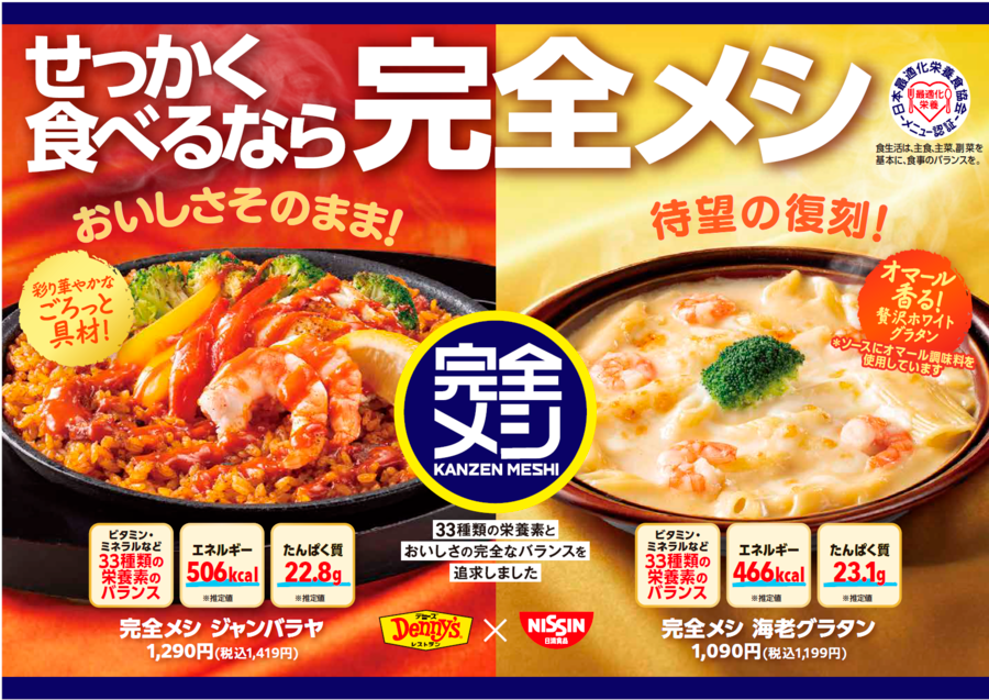 今回、「完全メシ」とファミリーレストラン「デニーズ」がコラボレーションし、「デニーズ」の人気メニュー「ジャンバラヤ」と、復刻を望む声が多く寄せられていた「海老グラタン」を "完全メシ化" し、「デニーズ」の店舗で販売します。