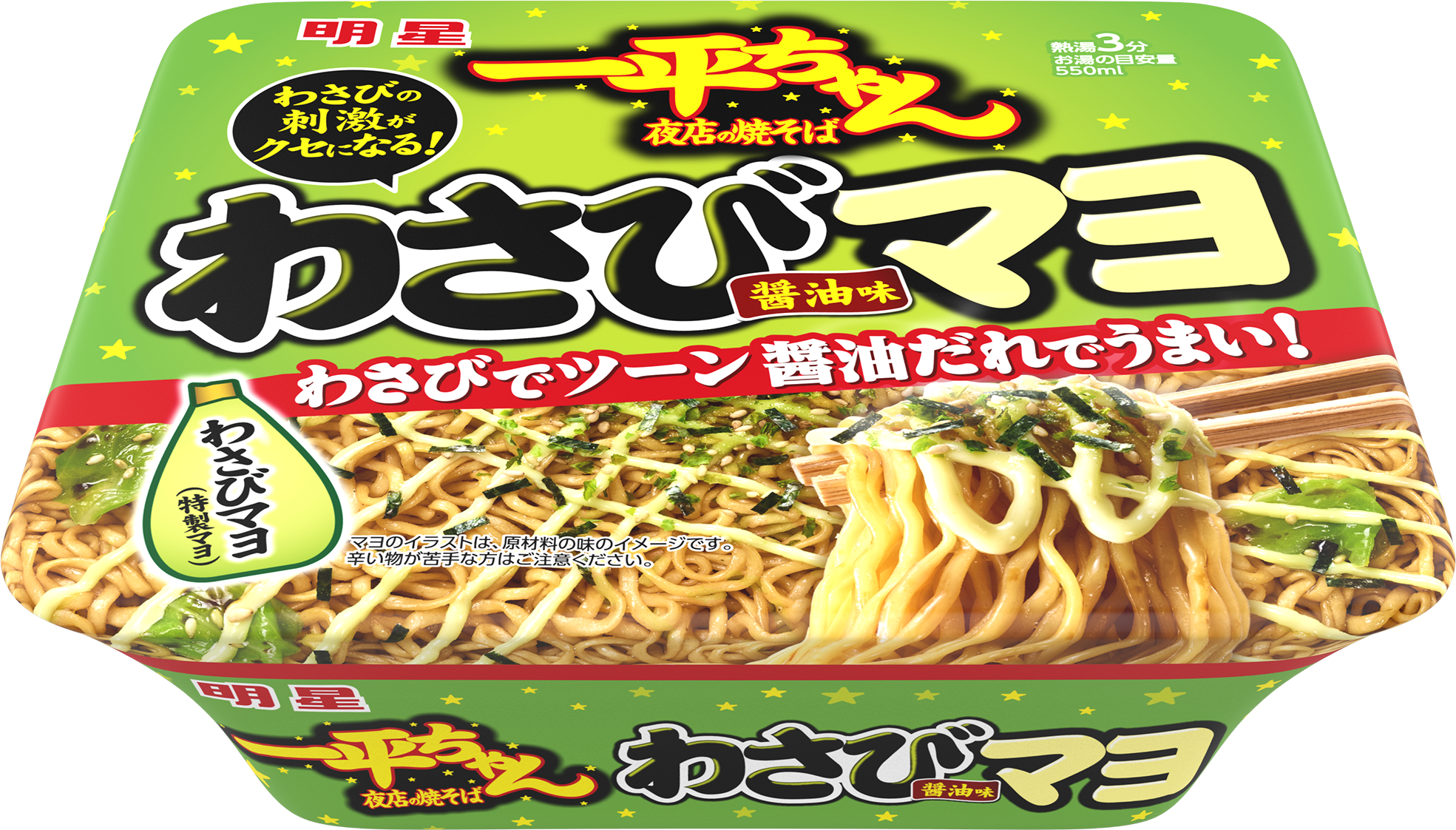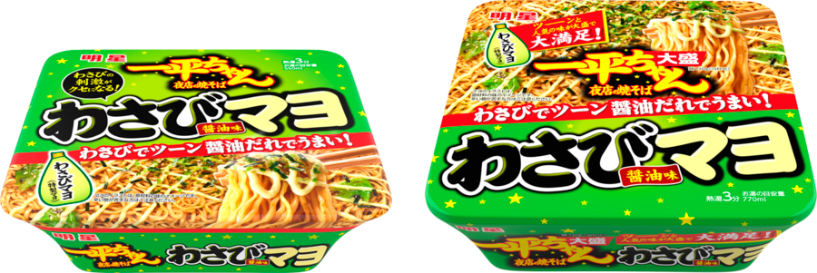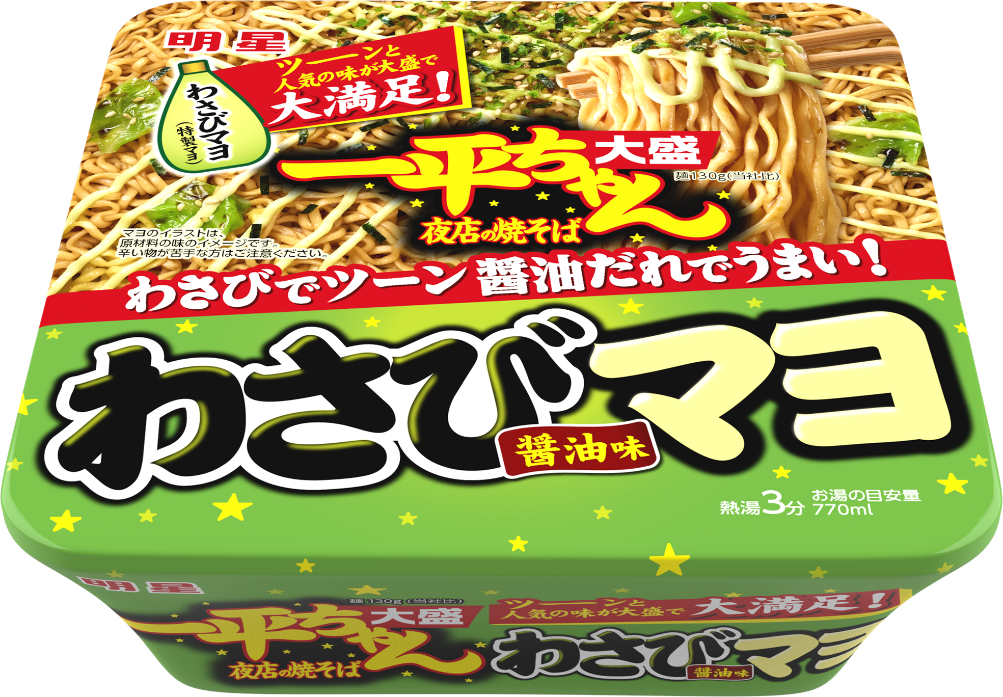 「明星 一平ちゃん夜店の焼そば」シリーズは数多くのメニューを発売してきましたが、中でも高い人気を誇っているのが「明星 一平ちゃん夜店の焼そば わさびマヨ醤油味」です。「一平ちゃん夜店の焼そば」の代名詞である「からしマヨ」に通じるわさびのツーンとした刺激に加え、わさびの爽やかな辛みと醤油だれの相性の良さが支持を集めています。今回は長年ご好評いただいている品質はそのままに、パッケージもこれまでの雰囲気を踏襲しつつ、新たに「わさびの刺激がクセになる!」というコピーを加え、より味わいを想起しやすくしました。さらに今年は、通常サイズに加え、味わいはそのままにボリュームを増やした、大盛サイズ「明星 一平ちゃん夜店の焼そば 大盛 わさびマヨ醤油味」も同時期に発売します。わさびマヨ醤油味ファンの方は、ぜひ大盛サイズもお試しください。