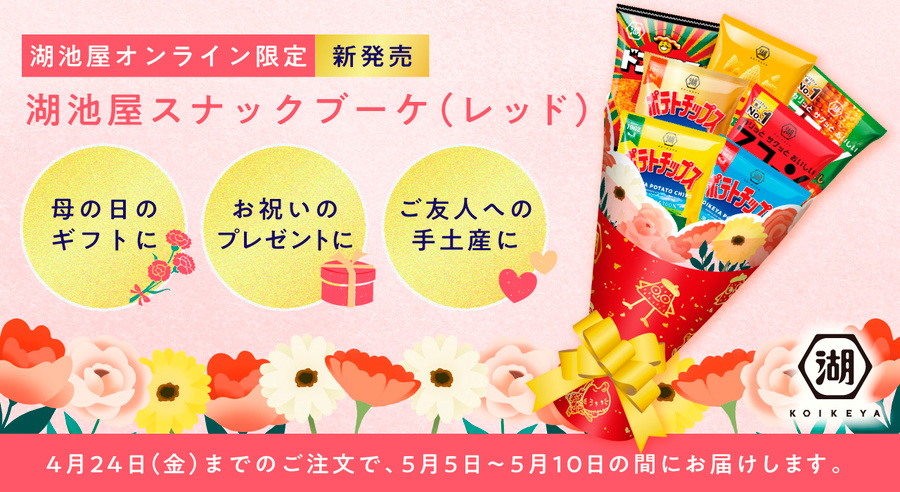花より団子、改め "花よりポテチ"。湖池屋が届ける新時代の花束「湖池屋スナックブーケ」をこの機会にぜひご検討ください。数量限定の受注販売かつ、今年の「母の日」までのお届けの場合、4月24日(金)までのご注文が必要となりますので、気になる方はお早めにどうぞ。