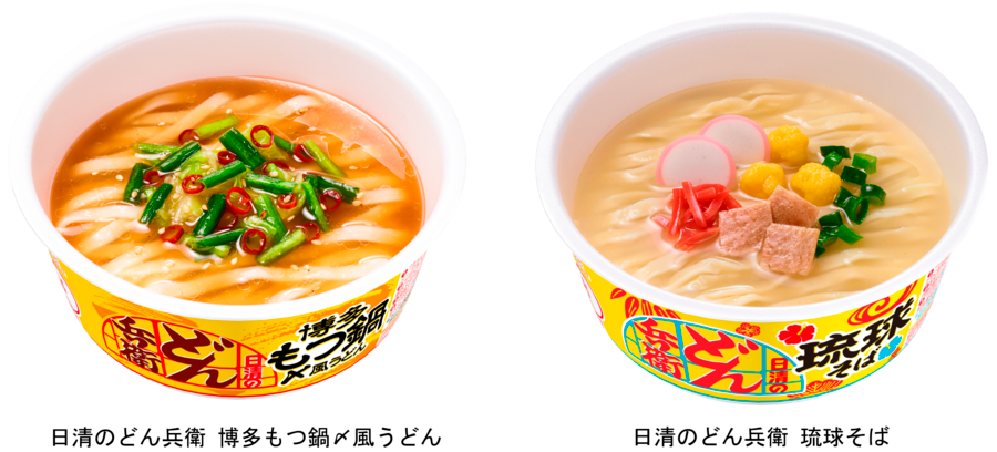 「日清のどん兵衛 博多もつ鍋〆風うどん」「日清のどん兵衛 琉球そば」(4月27日発売)