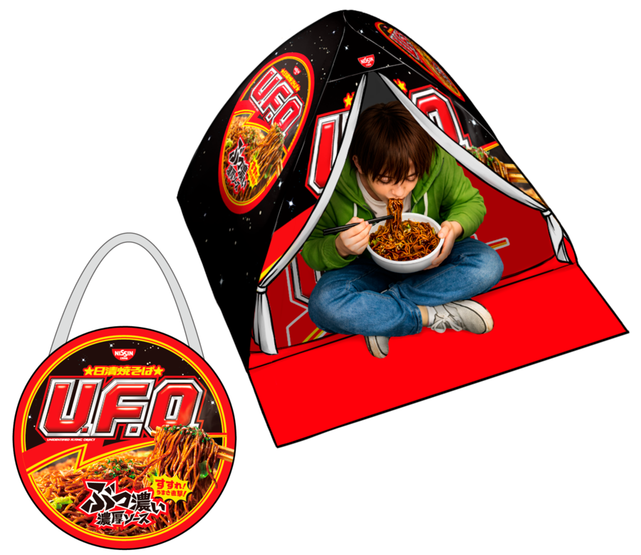 「U.F.O.」オリジナルデザインのポップアップテントです。入り口のファスナーを閉めると、"密閉空間" で「U.F.O.」の濃厚なソースの香りと風味に没入できます。「U.F.O.」のパッケージをイメージした収納バッグ付きです。(1~2人用)