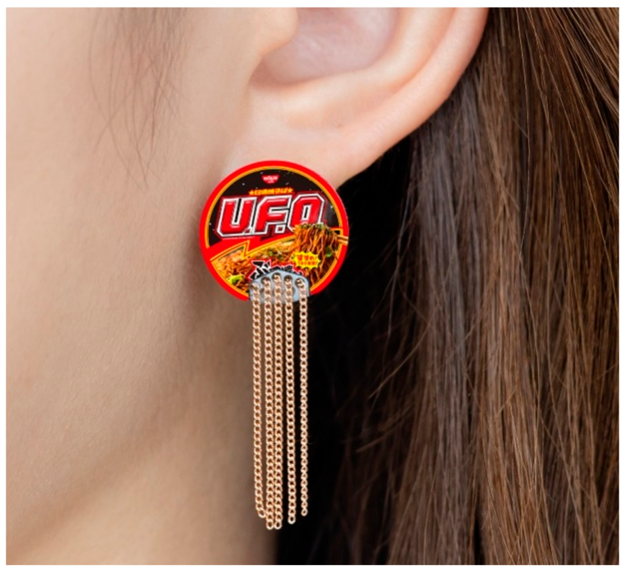「日清焼そばU.F.O.」公式Xアカウントの投稿で話題となった、「U.F.O.」の "湯切り穴" から麺が飛び出ているように見えるデザインのピアスです。(1セット2個入り)