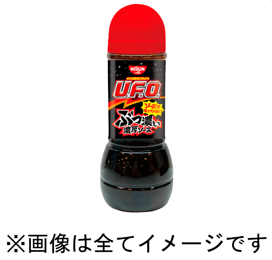 焼そばを鉄板で炒めたときの香ばしい風味やうまみを凝縮した "ぶっ濃い濃厚ソース" をボトルに詰めました。「U.F.O.」に "追いソース" するのはもちろん、さまざまな料理にかけてもおいしくお召し上がりいただけます。