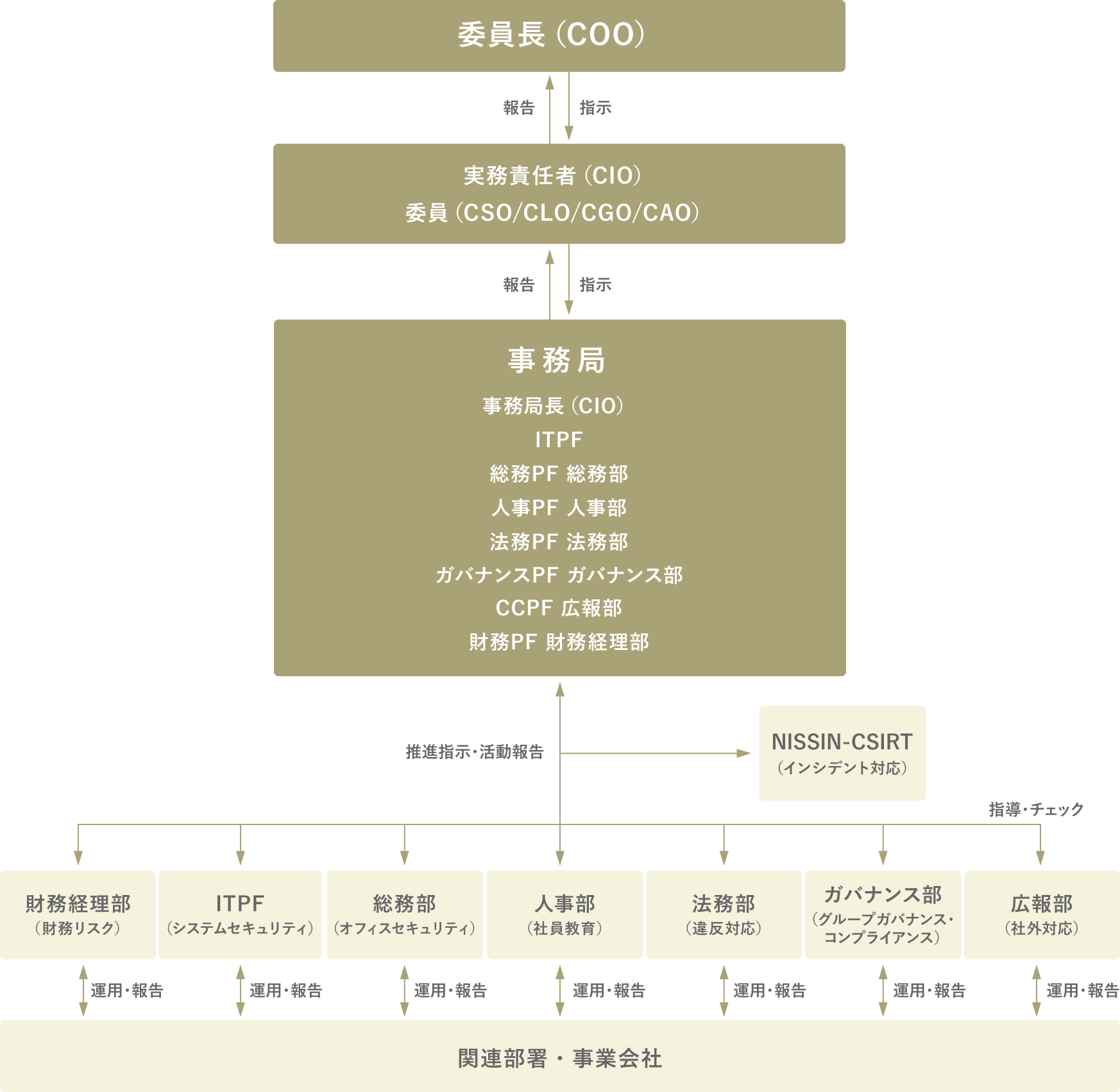 当社グループは、グループ全体における情報セキュリティへの取り組みを推進するために、情報セキュリティ委員会を設置しています。同委員会では、実務責任者であるCIOが情報セキュリティ戦略の立案・施策を推進し、情報資産と情報システムの取り扱いに関する包括的な責任を負っています。同委員会の事務局は、日清食品ホールディングスのITプラットフォーム、総務部、広報部、財務経理部、人事部、法務部、ガバナンス部の社員で構成され、グループ各社の情報セキュリティ担当責任者と連携しながら、セキュリティの管理やサイバー脅威への対策などを行っています。情報セキュリティに関するリスク、対策に伴う各種方針や施策について、取締役会は必要に応じて議論し、意思決定と指示を行っています。