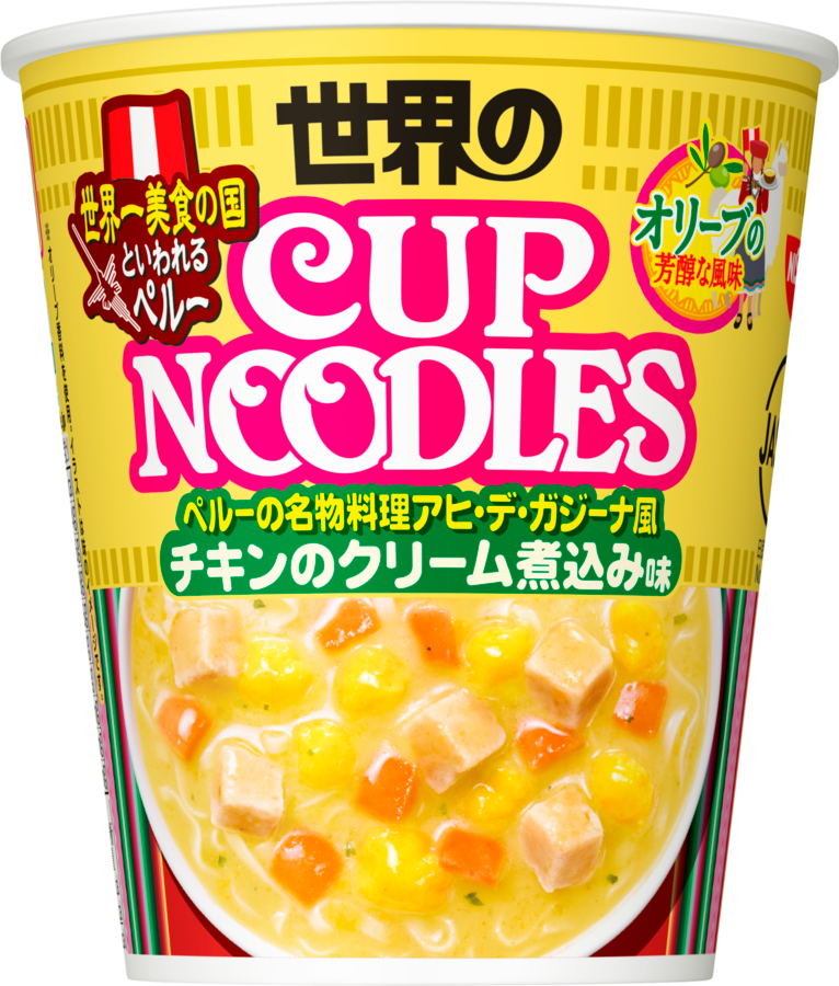 今回、"アヒ・デ・ガジーナ" を「カップヌードル」流にアレンジした「カップヌードル ペルー式チキンのクリーム煮込み味」を発売します。チキンのうまみを濃縮したクリーミーなスープに、ニンニクやパプリカなどを加えることで、濃厚かつパンチのある一杯に仕上げました。黄色唐辛子とオリーブの芳醇な風味*2がアクセントとなり、エキゾチックな味わいが際立ちます。