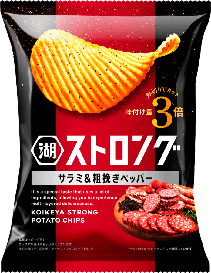 この度発売する「湖池屋ストロング サラミ&粗挽きペッパー」は、秋の食欲をかき立てる "旨みあふれる肉" の味わいをテーマに、エネルギーチャージとなるような濃厚で贅沢な味わいを目指しました。噛めば噛むほど肉の旨みが溢れ出し、ピリッと刺激的な黒胡椒のキレも合わさって、手が止まらなくなる本格的な逸品に仕上げました。