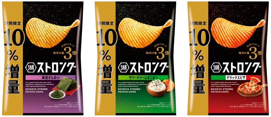 また、「湖池屋ストロング」定番商品3品 (海苔ざんまい、サワークリームオニオン、デラックスピザ) においても、2025年10月27日(月)より10%増量施策を実施します。