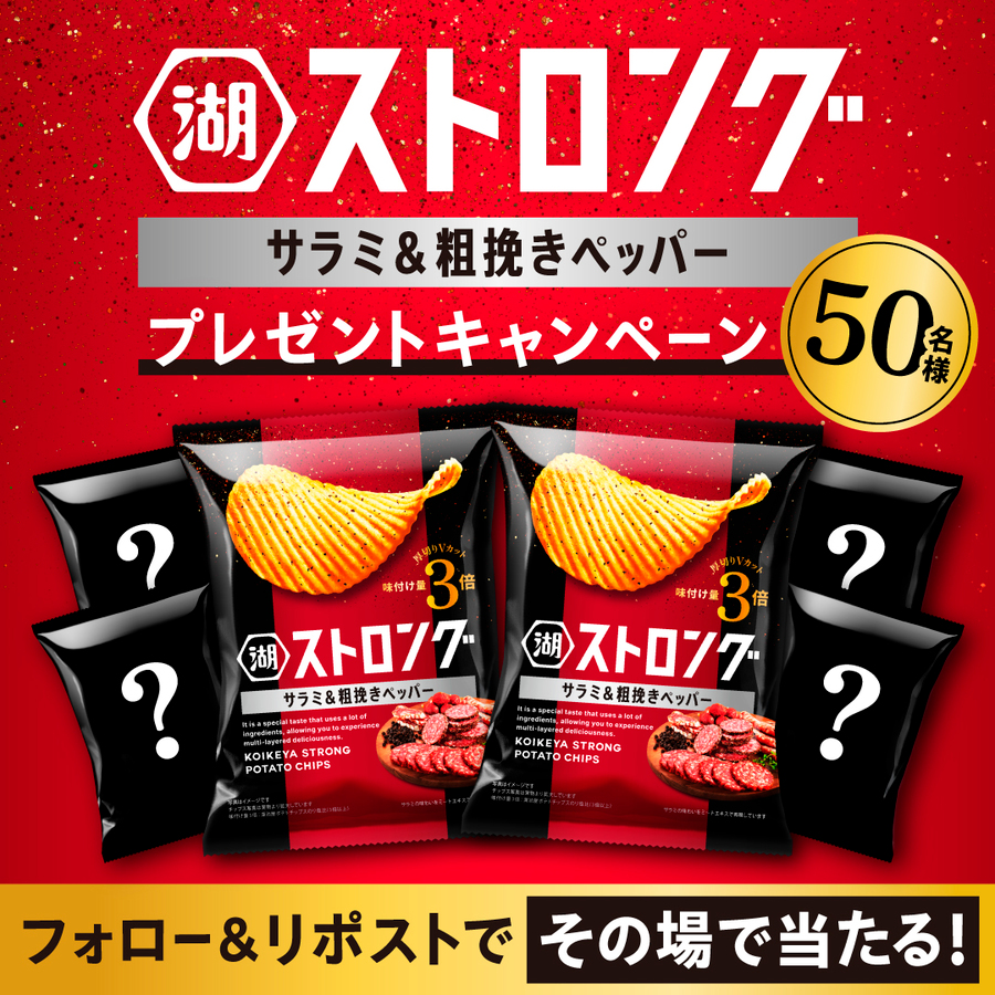 「湖池屋ストロング サラミ&粗挽きペッパー」の発売を記念して、当商品の美味しさと魅力を、みなさまにお伝えしたいとの思いから、新商品をプレゼントするキャンペーンを実施します。ぜひご参加ください。