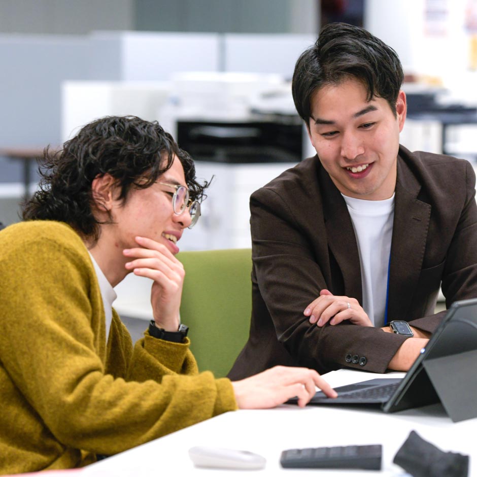 フリーアドレスは部署ごとに区切られないので、アイデアも生まれやすいですよね。僕は営業ですが、意外に営業以外の部署の人との雑談の中で、何かがひらめくこともあったりします。どこの部署でも上下関係なく気さくなメンバーばかりですし、社内公募もあってチャレンジしたい部署やグループ企業に異動希望も出せます。困りごとには一人で悩むのではなく、同僚、先輩、上司、と会社全体でサポートしてくれる雰囲気がありますね。