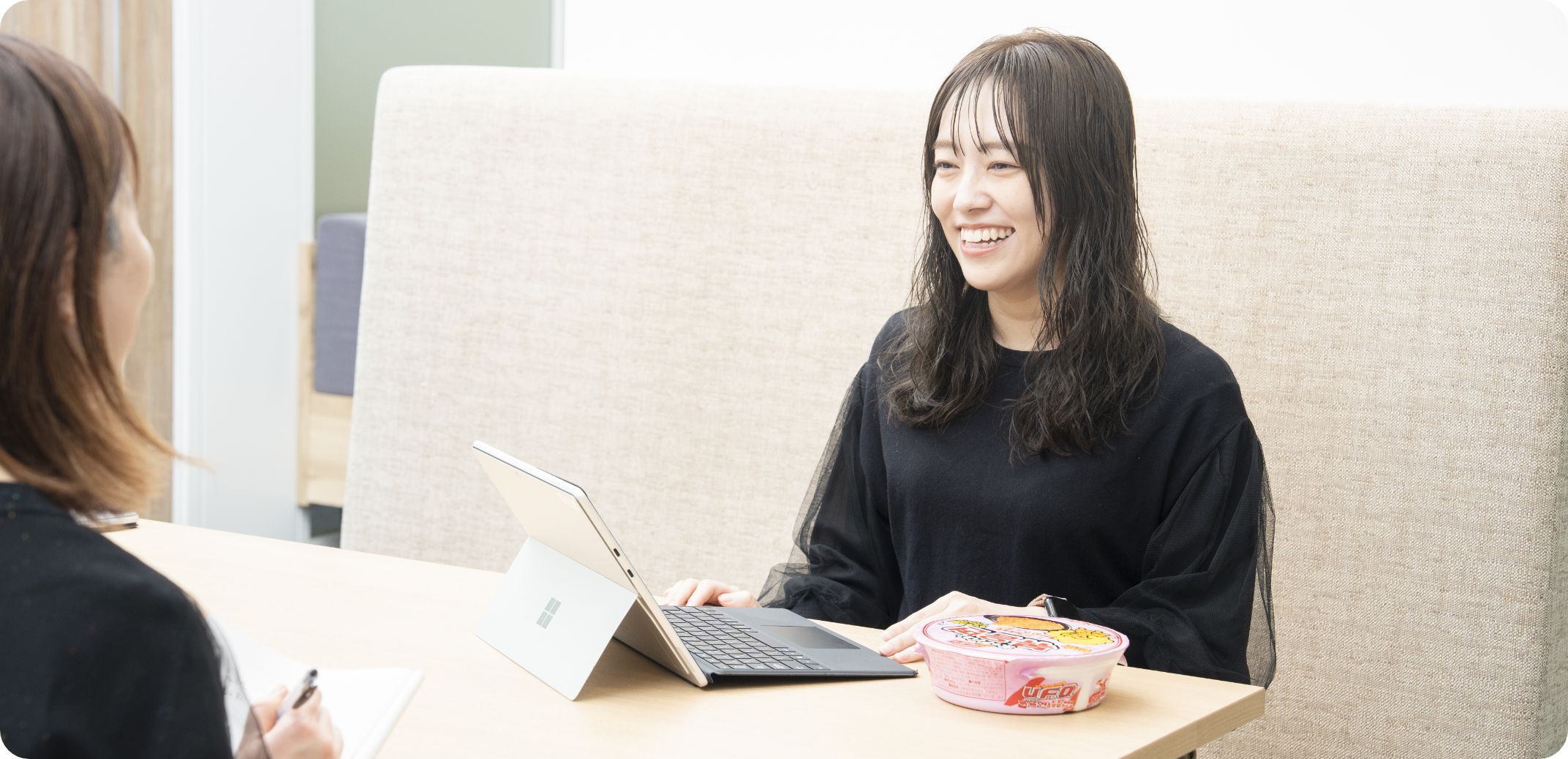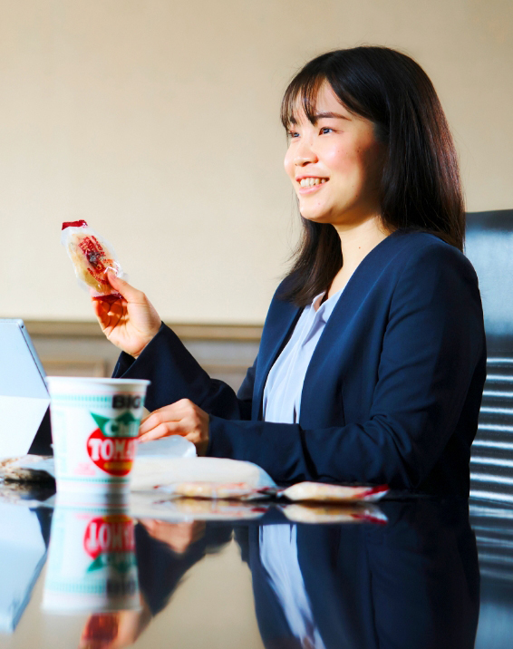 現在は、カップ焼そば「U.F.O.」のサブフレーバーや、新フレーバーのマーケティングを担当。「U.F.O.」を手にとってもらえる機会を増やすために、新しい食シーンをコンセプトにした商品を展開したり、キャンペーンやイベントを企画したりしています。