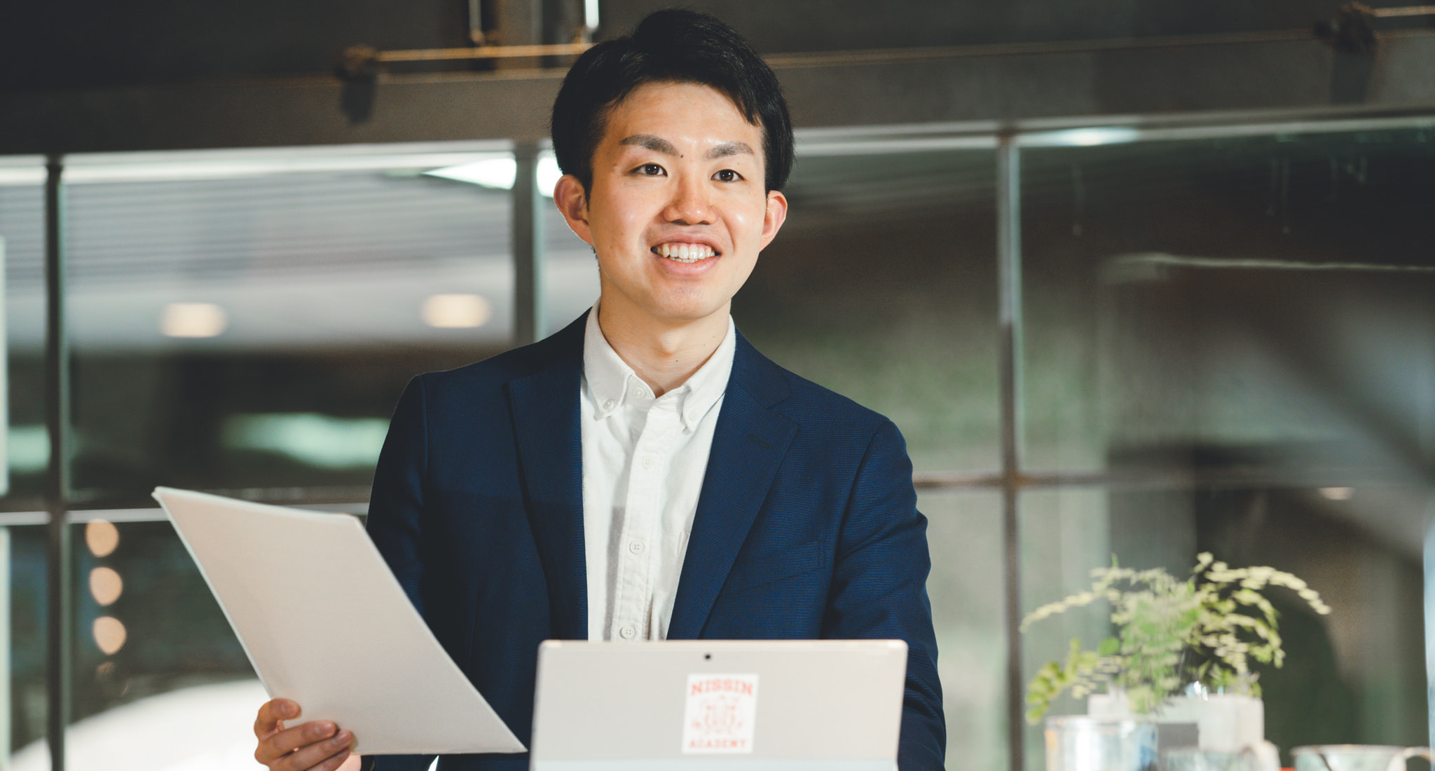 営業現場のレベルアップに貢献したいという想いから、営業向けの社員教育コンテンツ「Sales Academy」の立ち上げにも携わっています。これは、社員教育制度「NISSIN ACADEMY」のコンテンツの一つで、2020年度からスタートしました。営業をしていた時に感じていたことをヒントに、社内外の立ち上げメンバーと協力して、階層別コンテンツ作りを担当しています。営業は「経験しながら学ぶ」ことも大切ですが、体系的に学ぶアプローチがあればより理解が深まるのではないかと思っており、いつか社員教育の領域にも挑戦したいと考えていました。実際に研修を受けた時、感覚的に身につけてきたことが全て言語化されており、自分の経験やスキルを整理できたことに感動しました。