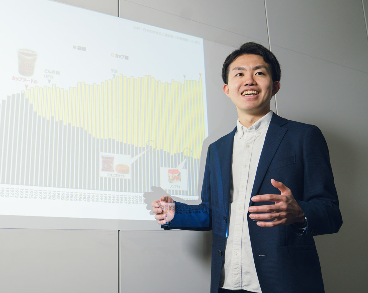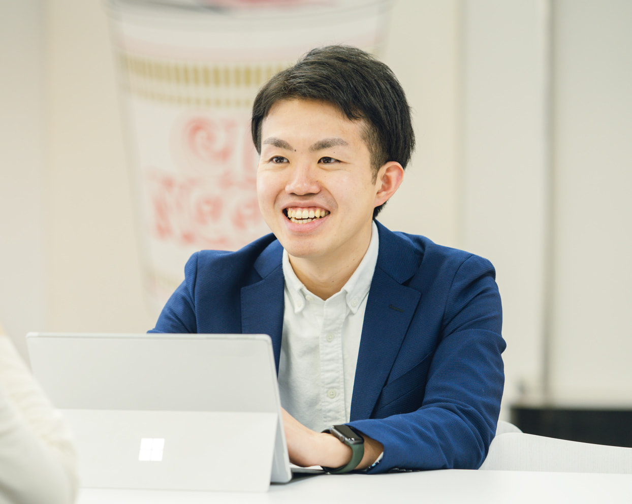 CMのユニークさと社員の気さくな雰囲気に惹かれ、日清食品に入りました。入社後は東北支店営業課で3年間、盛岡営業所で2年間、地域に密着した営業を経験しました。新人時代は、地元の取引先を多く任されましたが、「東京から来た新人です!」と挨拶に行っても相手にしてもらえない日々が続きました。めげずに毎週顔を出し続けると、「お茶でも飲んでいくか」と声をかけて頂けた時に、ようやく営業のスタートラインに立てた気がして嬉しかったことを覚えています。営業戦略部に異動してきた今でも、当時の取引先とは温かな関係が続いています。