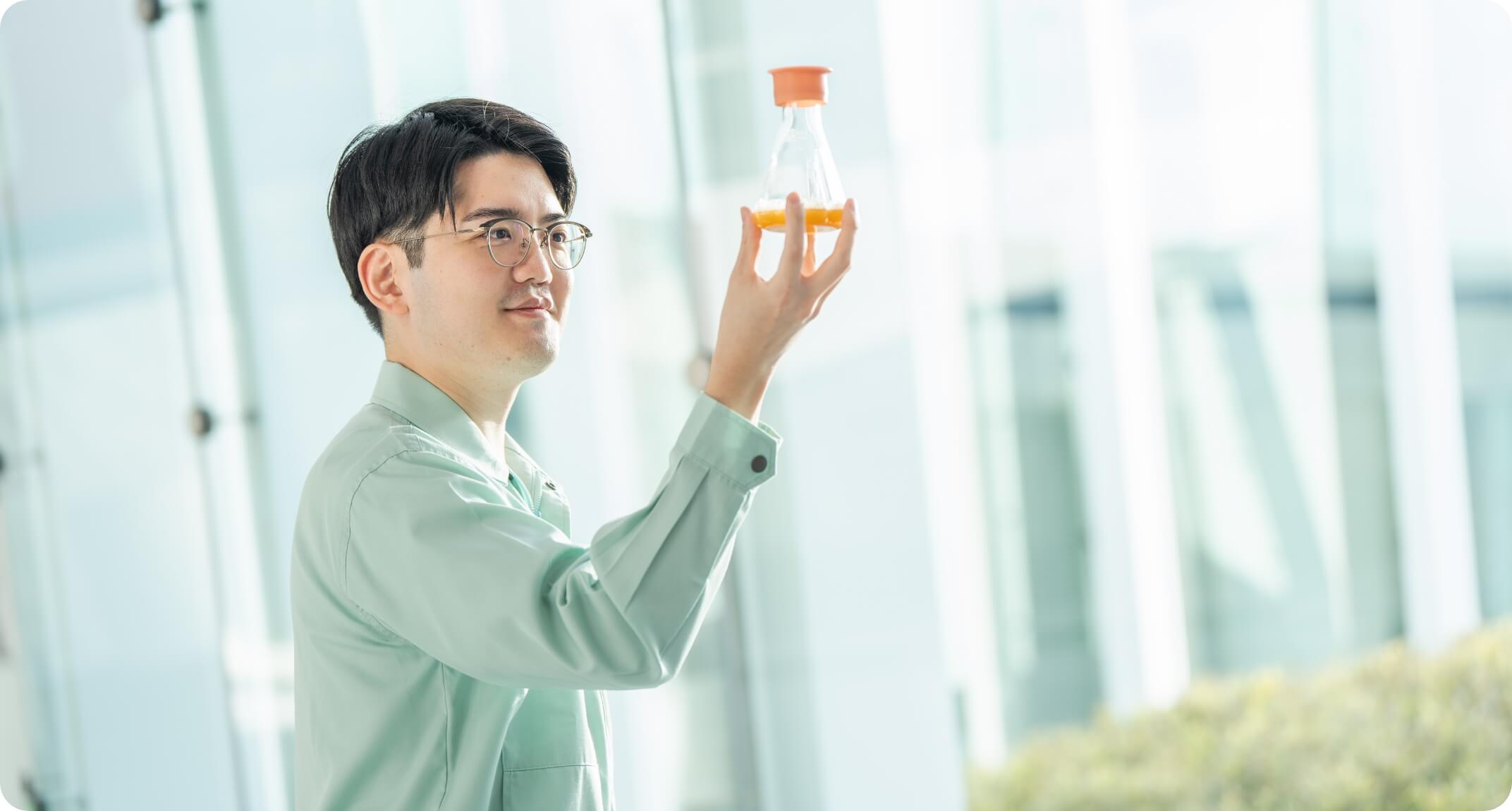 私は入社するまでほとんど微生物を扱ったことがなかったのですが、相手は生物ということもあり、気温などの条件によって機嫌が変わることも面白さの一つ。想定外のことも起こりますが、続けるなかで機嫌をコントロールするスキルも磨かれました。また研究は大学や国の研究機関などと共同で行う機会も多く、頻繁に進捗共有やディスカッション、技術習得を行っています。2021年には共同研究先の大学に1年間出向して、油脂酵母の最先端技術を学び、研究所に持ち帰りました。部内でのディスカッションも活発で、多角的な視点に触れて研究のヒントを得ることも。こうした社内外との関わりのなかで、着実に研究が前進していると感じます。