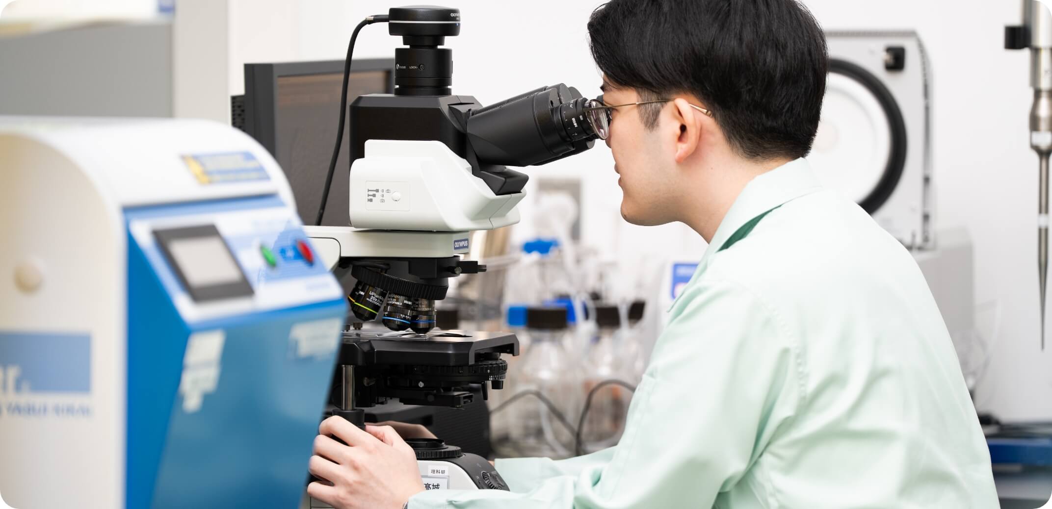 入社後は、培養肉などの最先端フードテックや乳酸菌・食物繊維などの機能性素材の基礎研究から製品開発までを行う、健康科学研究部に配属されました。私たちのミッションは、未来を見据えた基礎研究を行うなかで革新的な技術を開発し、会社の新しい商品の柱をつくっていくこと。入社後すぐ課された研究テーマは、即席麺に欠かせない植物油「パーム油」の代替素材をつくることでした。私は昔から「誰もやったことのないことをやりたい、未知の物事を自分の手で明らかにしたい」という思いが強く、未来の資源調達に関わる大きな研究テーマに強いモチベーションを感じています。