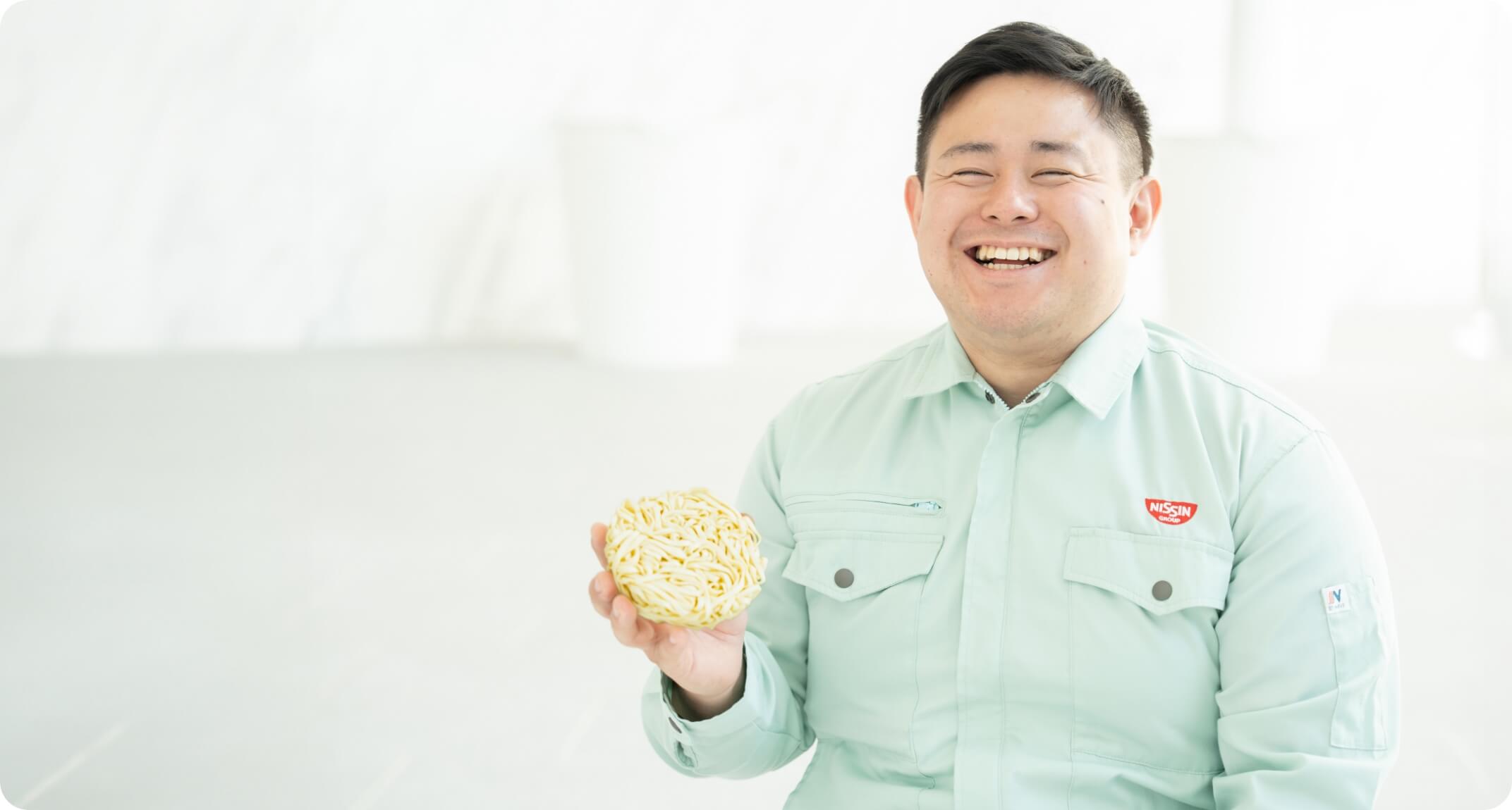 現在の主な業務は、即席麺に使われる麺の開発です。スープ、具材、包材の各チームと連携しながら商品に合う麺を選定したり、新しい形状や食感の麺を一から開発しています。麺を選んだ理由は、初期研修のときに「一番職人色が強くて面白そう」と感じたから。麺づくりは小麦を練る・揚げるなどの手作業が多く体力が求められるため、自分に向いていると感じます。また開発を始めて特に驚いたのは、麺の種類の多様さと奥深さです。麺の開発はまだまだ課題も多いのですが、だからこそ自分の手で課題を解明し、新しい価値をつくり出せる可能性に大きなやりがいを感じています。
