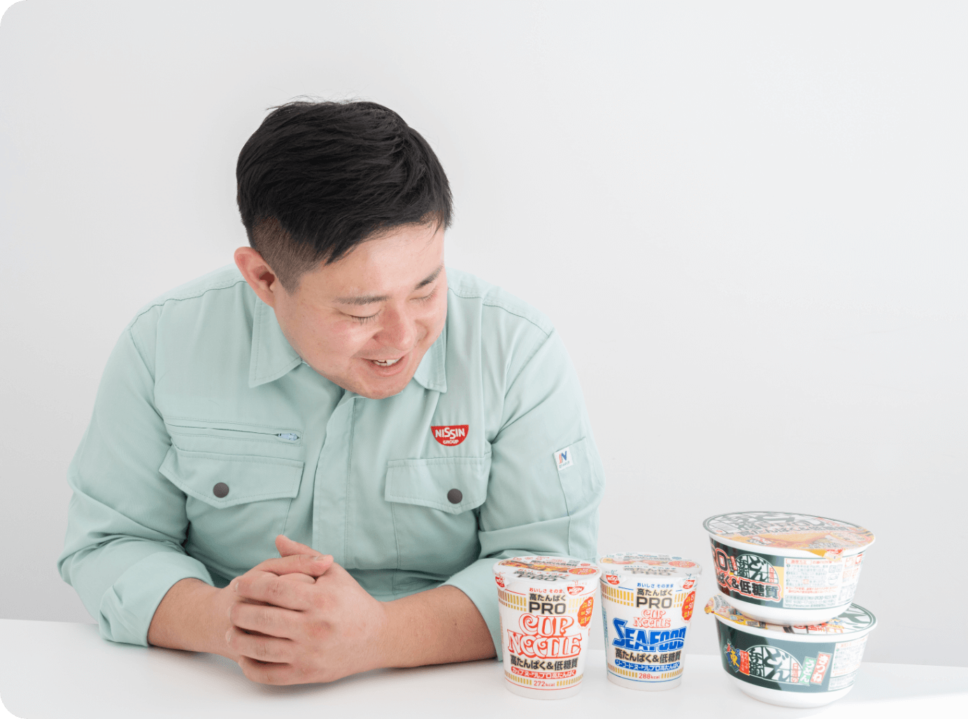 昔からおいしいものを食べることが好きで、大学では主に海産物の栄養とその働きについて研究していました。またアメリカンフットボール部に在籍し、丈夫な体づくりを心掛けていたことから、「食」の大切さを感じており、将来は食品に関わる研究者になろうと考えていました。日清食品のイメージは、「日本人なら誰もが知っている、奇抜で面白い商品をつくっている会社」。大学での会社説明会で「開発者に必要なのは、科学を知る”研究者気質”と、理想のものづくりを追求する”職人気質”」という先輩社員の言葉に惹かれ、自分が目指すものはこれだと感じました。また就職活動で出会った社員からは、おいしさや面白さ以上に「安心安全で品質の高いものを生み出す」ことへの強い情熱に共感し、「自分も食を通じて、人々に喜びや驚きをつくり出す側になりたい」と思い、入社を決めました。